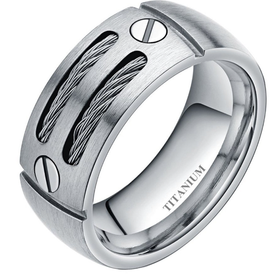 Dieser Ehering aus Titan wurde mit einem Stahlkabel verziert.